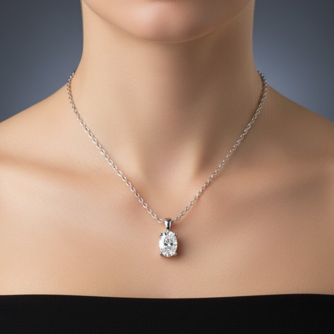 Το κρεμαστό μας κόσμημα διαθέτει ένα λαμπερό οβάλ διαμάντι, που συγκρατείται με ασφάλεια από τέσσερις πινέζες, δημιουργώντας ένα διαχρονικό και ευέλικτο σχέδιο που δεν θα βγει ποτέ από τη μόδα.