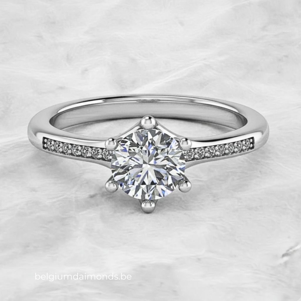 La bague en or 18 carats de Belgium Diamonds présente un élégant anneau en or 18 carats avec une monture classique à 6 branches et des pierres latérales pavées, rehaussant la brillance et l'éclat du diamant central.