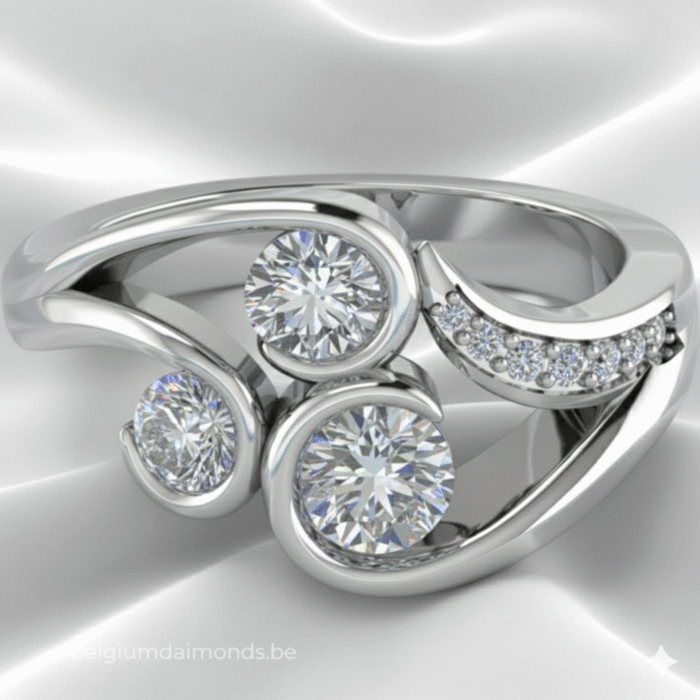 Belgium Diamonds Organic Elegance Three-Stone Ring Setting è un anello trilogy unico nel suo genere. Questa splendida montatura abbina perfettamente tre diamanti rotondi a forma di brillante per creare un gioiello squisito.