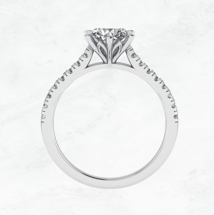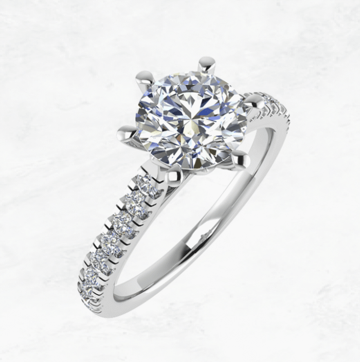 This ring features a dazzling round brilliant-cut center diamond, held securely in a classic six-prong setting that maximizes brilliance and light return.