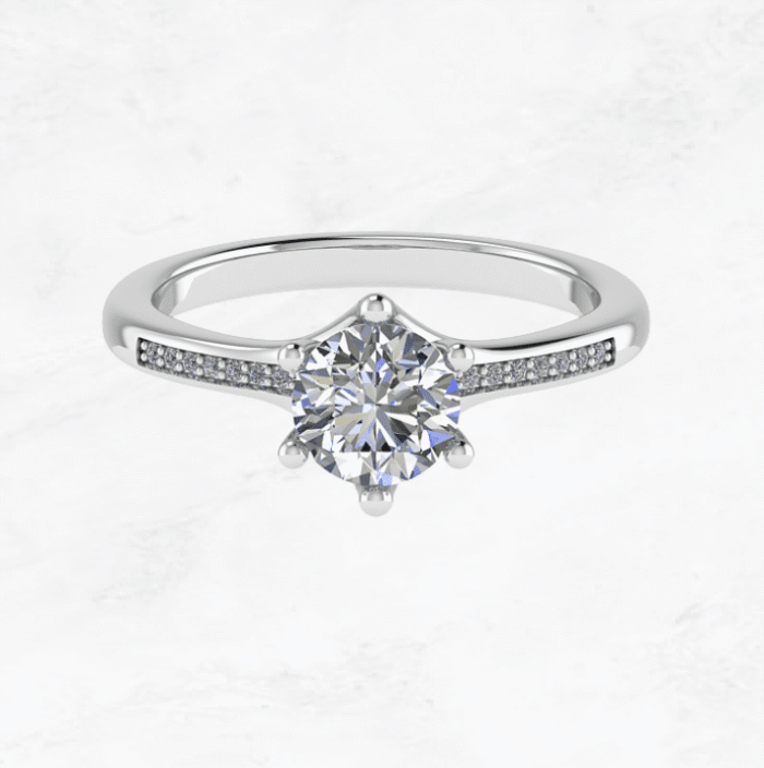 Belgium Diamonds Round Brilliant Cut Diamond Ring features a sleek 18k gold band with a classic 6-prong setting and pavé-set side stones, enhancing the center diamond’s brilliance and sparkle.
