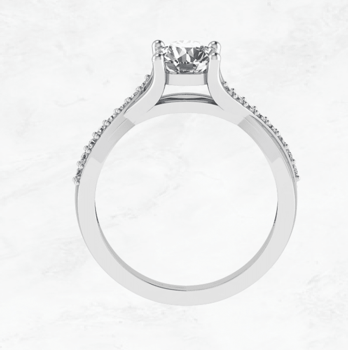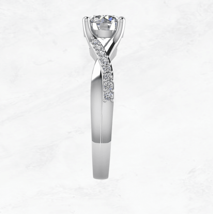 Belgium Diamonds Round Brilliant Cut Engagement Ring in 18k gold features a graceful twist shank adorned with pavé-set diamonds, leading up to a secure four-prong setting that elevates the center stone for maximum brilliance.