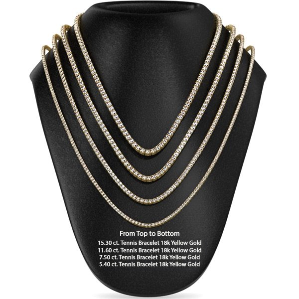 This ravishing classic diamond tennis necklace features 117 round, Color E/F, Clarity VS/TOP-SI (perfectly eye clean) diamonds set in a 18k white, yellow or pink gold bracelet. Each diamond is an average over 0.13 ct giving this special and sparkling tennis neckalce a *total carat weight of 15.30 ct.