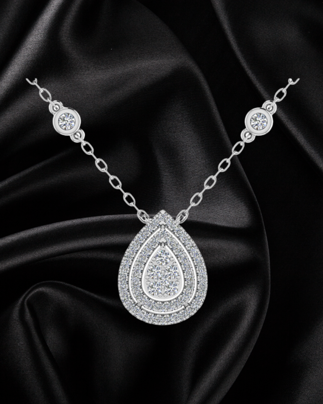 The Ready-to-wear Double Halo Pear PendantΒ is a stunning and classic piece of jewelry that will add elegance and sophistication to any outfit. Meticulously crafted with an 18k gold stylish chain available in white, yellow, or rose gold.