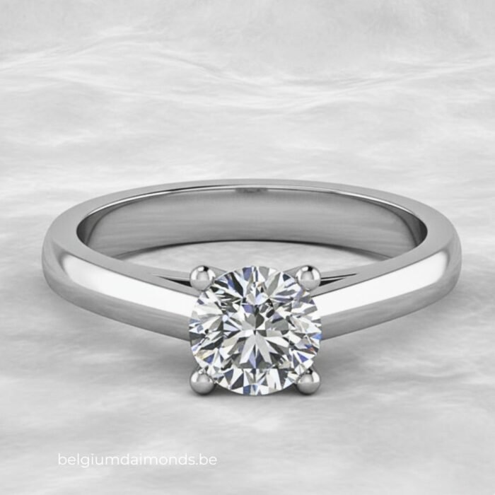 A timeless solitaire design, this engagement ring showcases a dazzling round brilliant-cut diamond elevated in a secure four-prong setting. The graceful cathedral-style shoulders sweep upward to meet the center stone, adding both height and elegance while allowing maximum light to enhance the diamond’s sparkle. Crafted in polished white gold, this ring embodies pure sophistication and enduring romance.