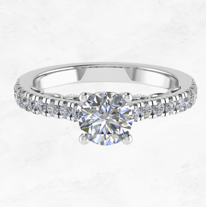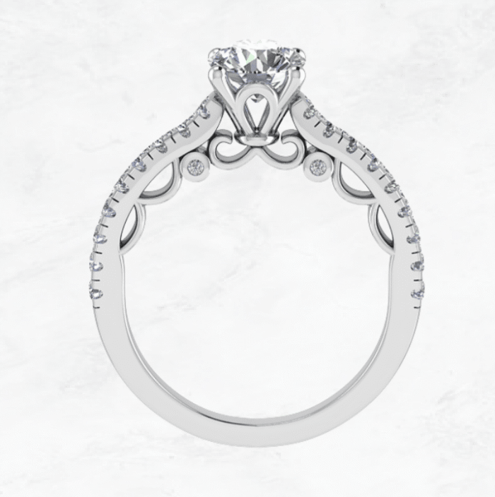 Belgium Diamonds Vintage-Inspired Pavé Solitaire Ring features an 18k gold band adorned with delicate pavé-set diamonds along the shoulders, leading to a secure prong-set center stone. The intricate filigree detailing beneath the setting adds a romantic, vintage touch while enhancing the sparkle of the center diamond.