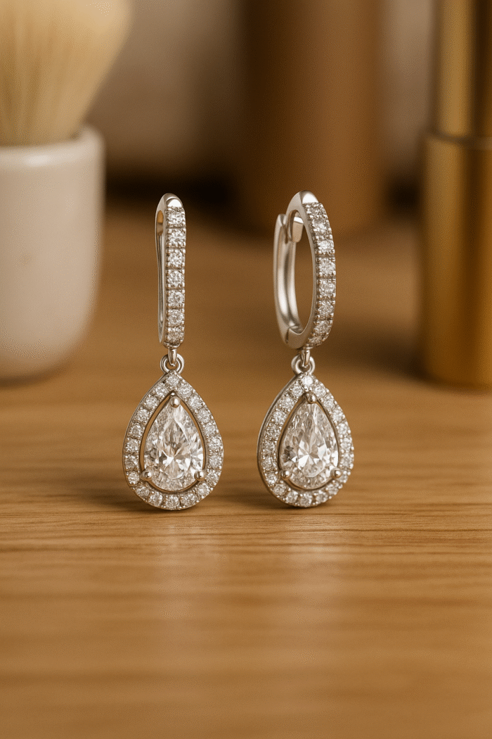 Crafted in 18K white gold, these earrings are the perfect blend of glamour and grace — ideal for weddings, evening wear, or the modern woman who appreciates refined luxury.