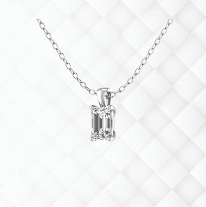 Our pendant features a brilliant emerald diamond, securely held in place by four prongs, creating a timeless and versatile design that will never go out of style.